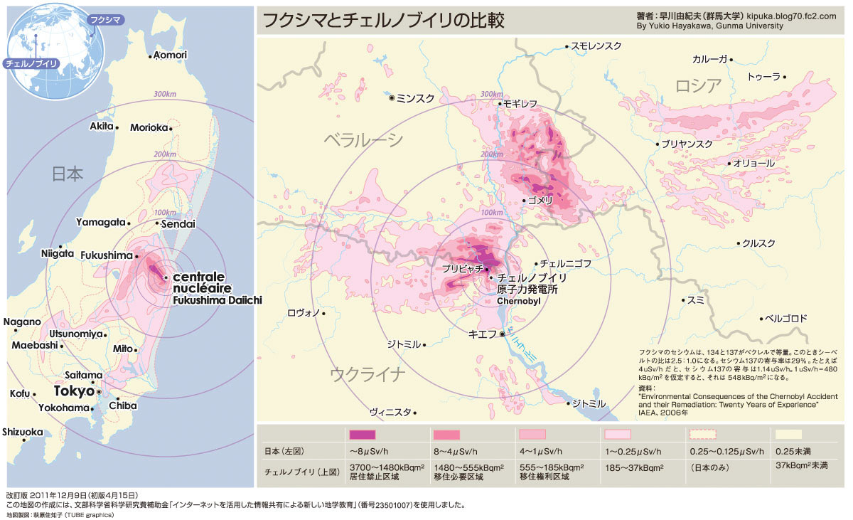 Depuis l'accident nucléaire du Tohoku suite au 11 mars 2011, on a souvent comparé Fukushima à Tchernobyl. Yukio Hayakawa, professeur volcanologue à l'Université de Gunma, a eu l'idée de proposer un document qui met côte à côte et concrètement les diffusions radioactives des deux catastrophes.