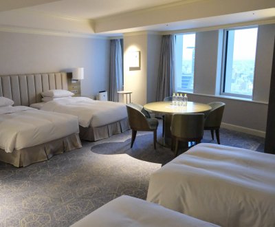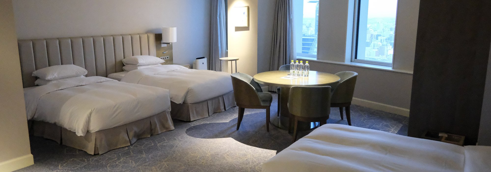 Le constat est différent pour les chambres familiales où la vue est décevante, en particulier les Fourth qui accueillent jusqu'à 4 personnes. En effet, les généreux 54 m² de la pièce de nuit donnent sur 3 petites fenêtres fixes orientées dans un coin de la façade. Ainsi, on a une vue directe sur les escaliers extérieurs des sorties de secours de l'hôtel puis, si l'on cherche un peu plus loin, on reconnaît seulement le bâtiment du Meitetsu Grand Hotel et le gratte-ciel Mode Gakuen Spiral Tower. On ne s'attarde donc pas à contempler cette vue étriquée depuis la fenêtre.