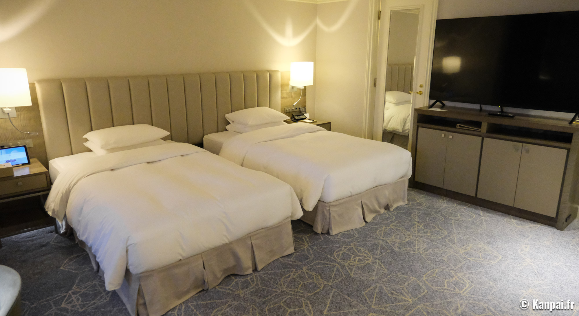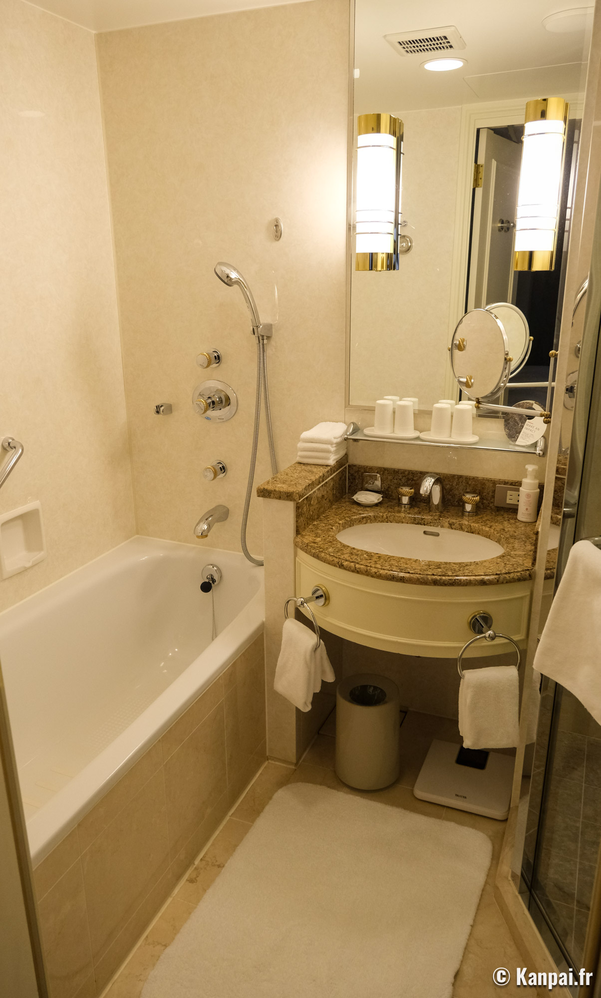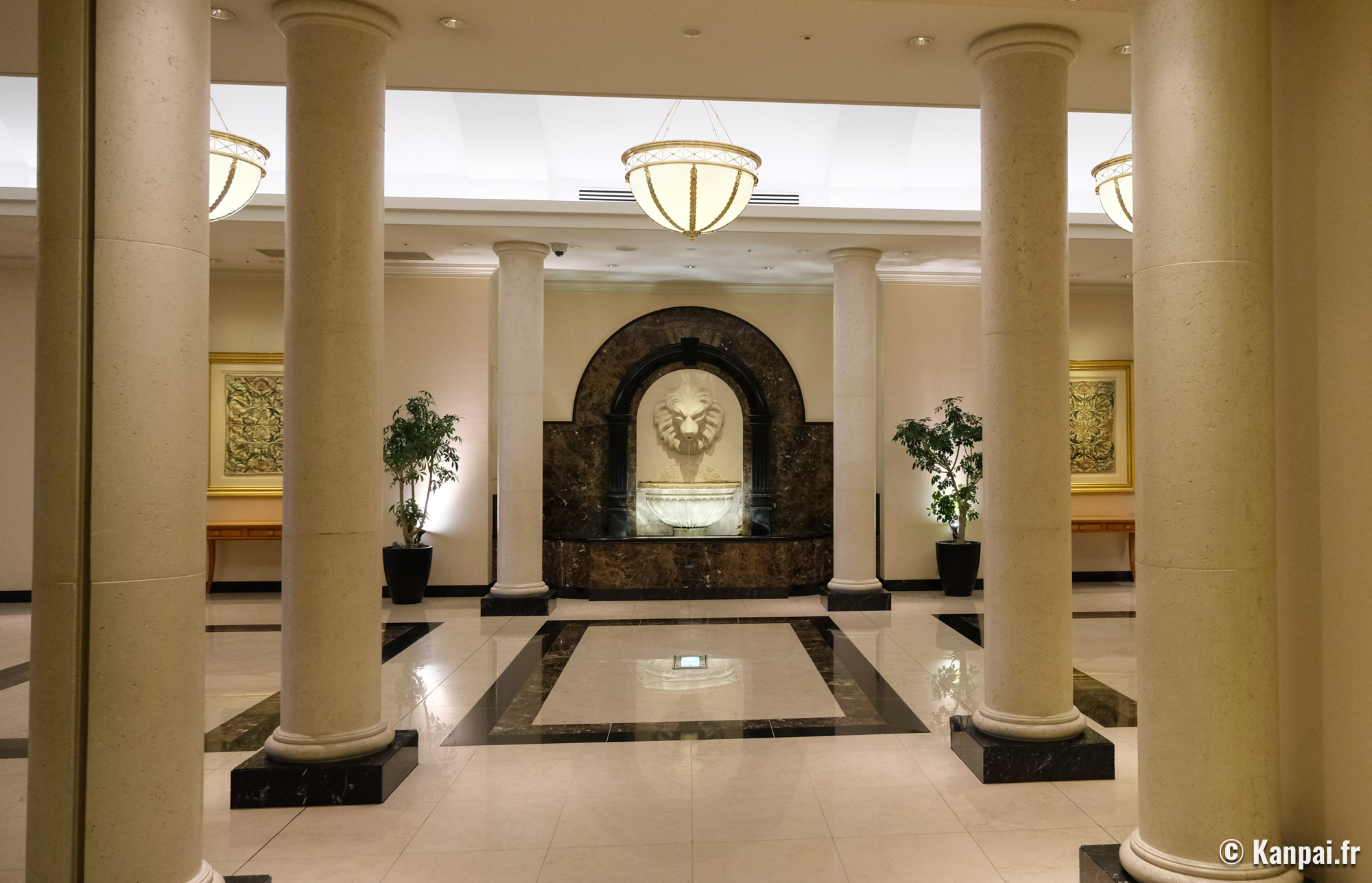Les chambres de l'hôtel, hors suites, affichent une décoration intérieure similaire dans des tons beiges et avec une moquette au sol de couleur foncée. On retrouve ce parti-pris design au sein des couloirs et du hall de réception, à la fois luxueux en terme de volume mais quelque peu daté concernant certains éléments distinctifs comme la fontaine à tête de lion ou encore le sol carrelé brillant et le jeu de colonnades à l'entrée. On met également un bémol sur la salle de bains 🛁 privée, certes toute équipée mais selon des standards japonais également un peu à l'ancienne, notamment les lavabos arrondis en pierre de granit peu modernes.