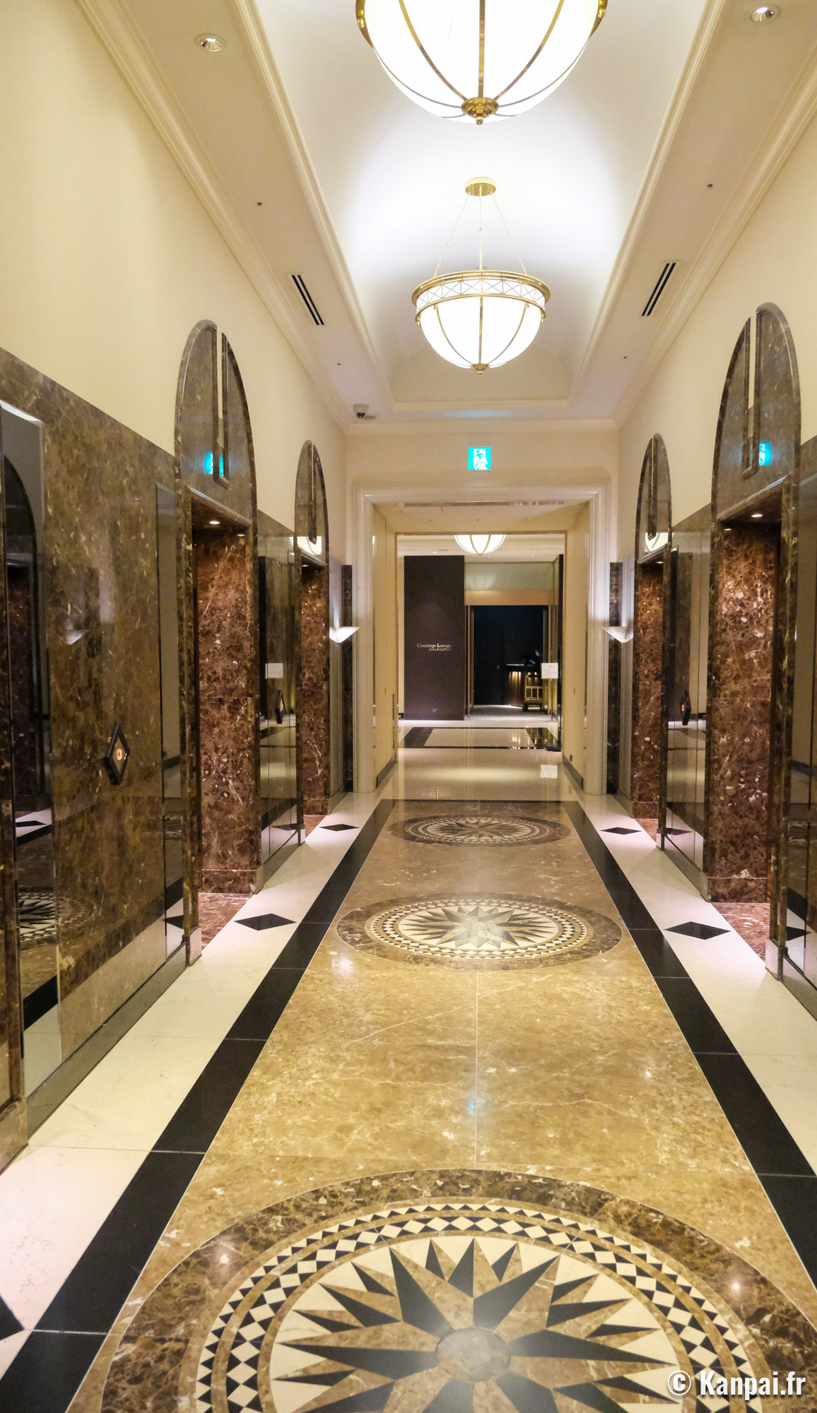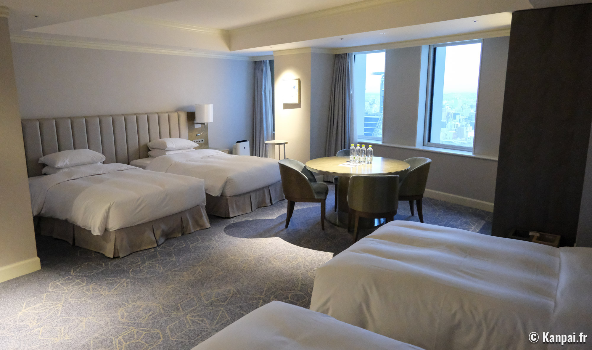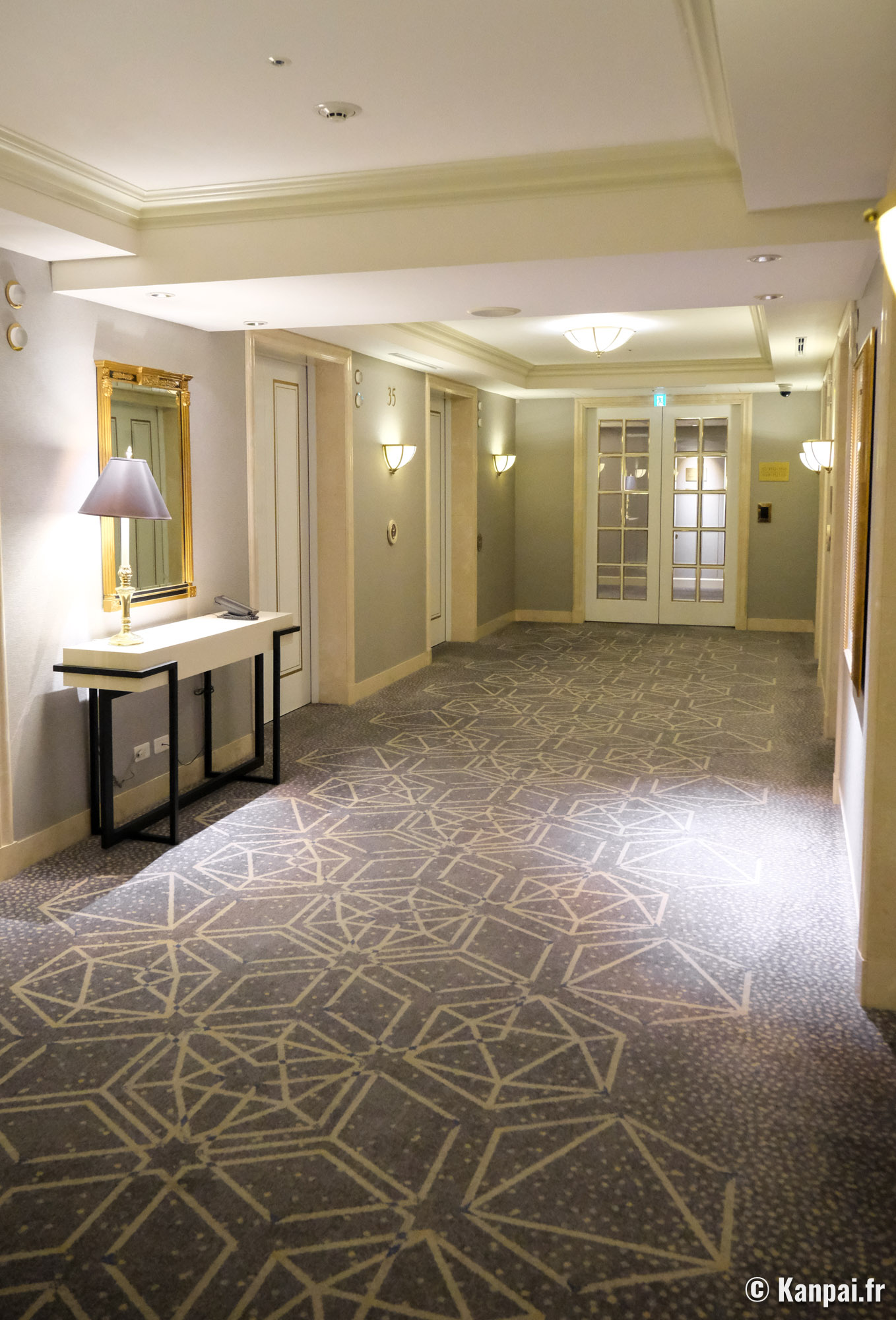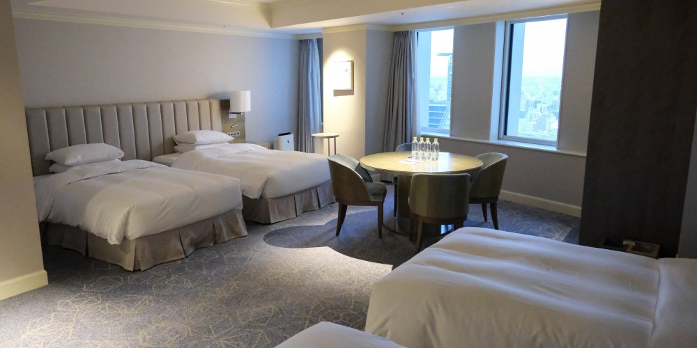 Les chambres de l'hôtel, hors suites, affichent une décoration intérieure similaire dans des tons beiges et avec une moquette au sol de couleur foncée. On retrouve ce parti-pris design au sein des couloirs et du hall de réception, à la fois luxueux en terme de volume mais quelque peu daté concernant certains éléments distinctifs comme la fontaine à tête de lion ou encore le sol carrelé brillant et le jeu de colonnades à l'entrée. On met également un bémol sur la salle de bains 🛁 privée, certes toute équipée mais selon des standards japonais également un peu à l'ancienne, notamment les lavabos arrondis en pierre de granit peu modernes.