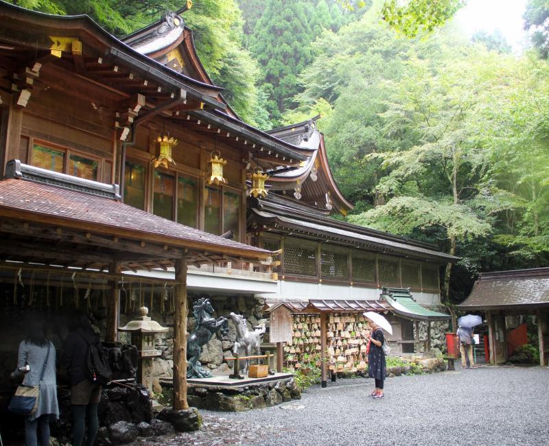 Berceaux historiques de la ville, les pavillons du Kibune-jinja se dressent fièrement face aux visiteurs parvenus à gravir les nombreuses marches en pierre. Dédié à la divinité de l’eau et de la pluie ☔️ qui protège les récoltes, on ne connaît pas exactement la date de construction de ce sanctuaire très ancien ; néanmoins il s'agirait de l’endroit légendaire où s'échoua une déesse kami partie de la baie d'Osaka sur un bateau 🛥️ de couleur jaune (貴 ki pour jaune, 船 fune pour bateau).