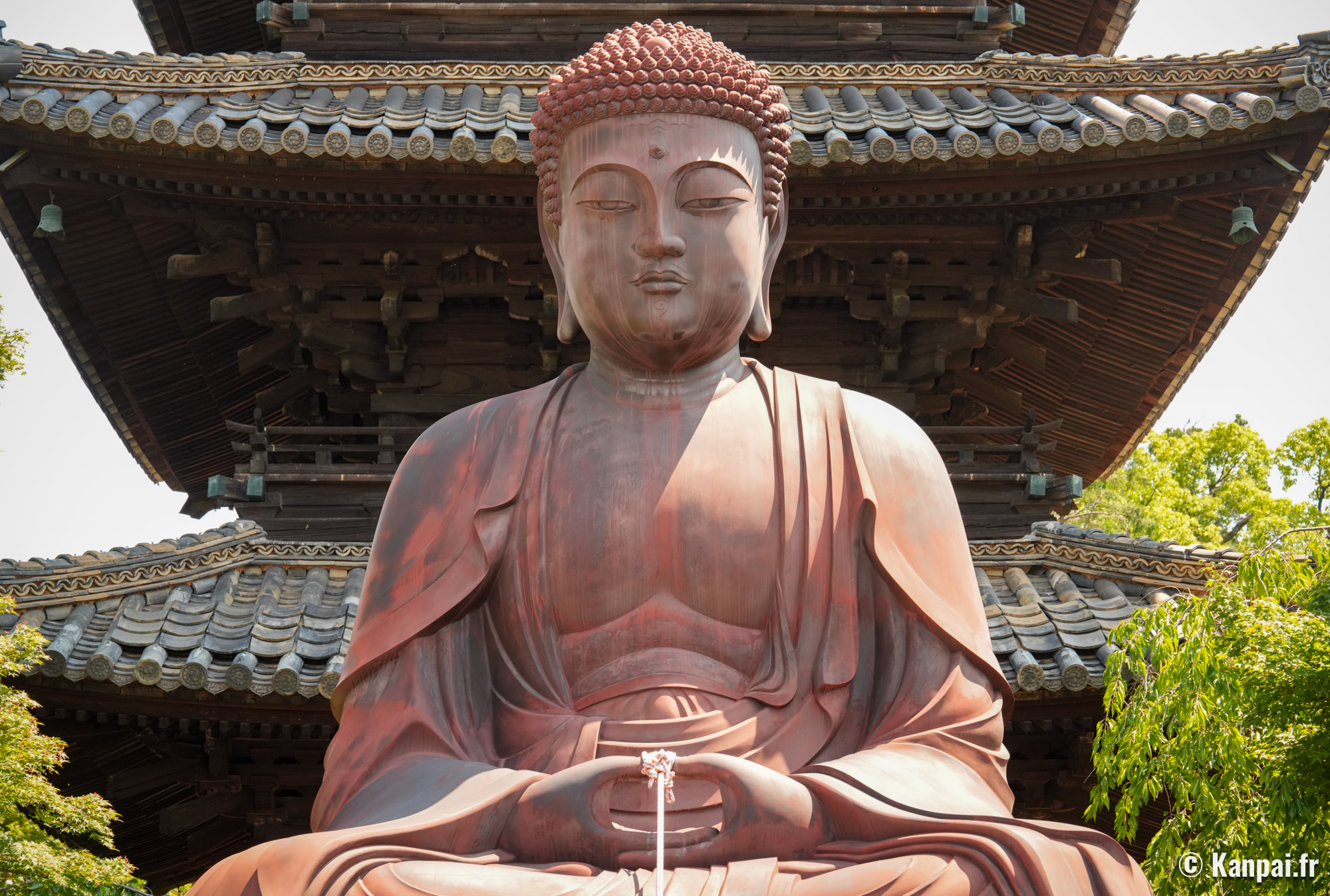On est d'abord attirés par le magnifique grand Bouddha (Daibutsu) de couleur rouge que l'on remarque dès le début de la visite, installé entre 2 authentiques pavillons en bois du temple que sont la porte Chu-mon et la pagode de 5 étages construite en 1808. Cette perspective s'avère aussi photogénique qu'impressionnante à contempler sur place. À noter que cette statue en bronze avec une finition laquée, d'une hauteur de 17,1 mètres pour un poids d'environ 6 tonnes, peut être déplacée au gré des besoins de maintenance du site. Ainsi, on peut la retrouver orientée de manière différente ou bien placée devant un autre pavillon du temple.