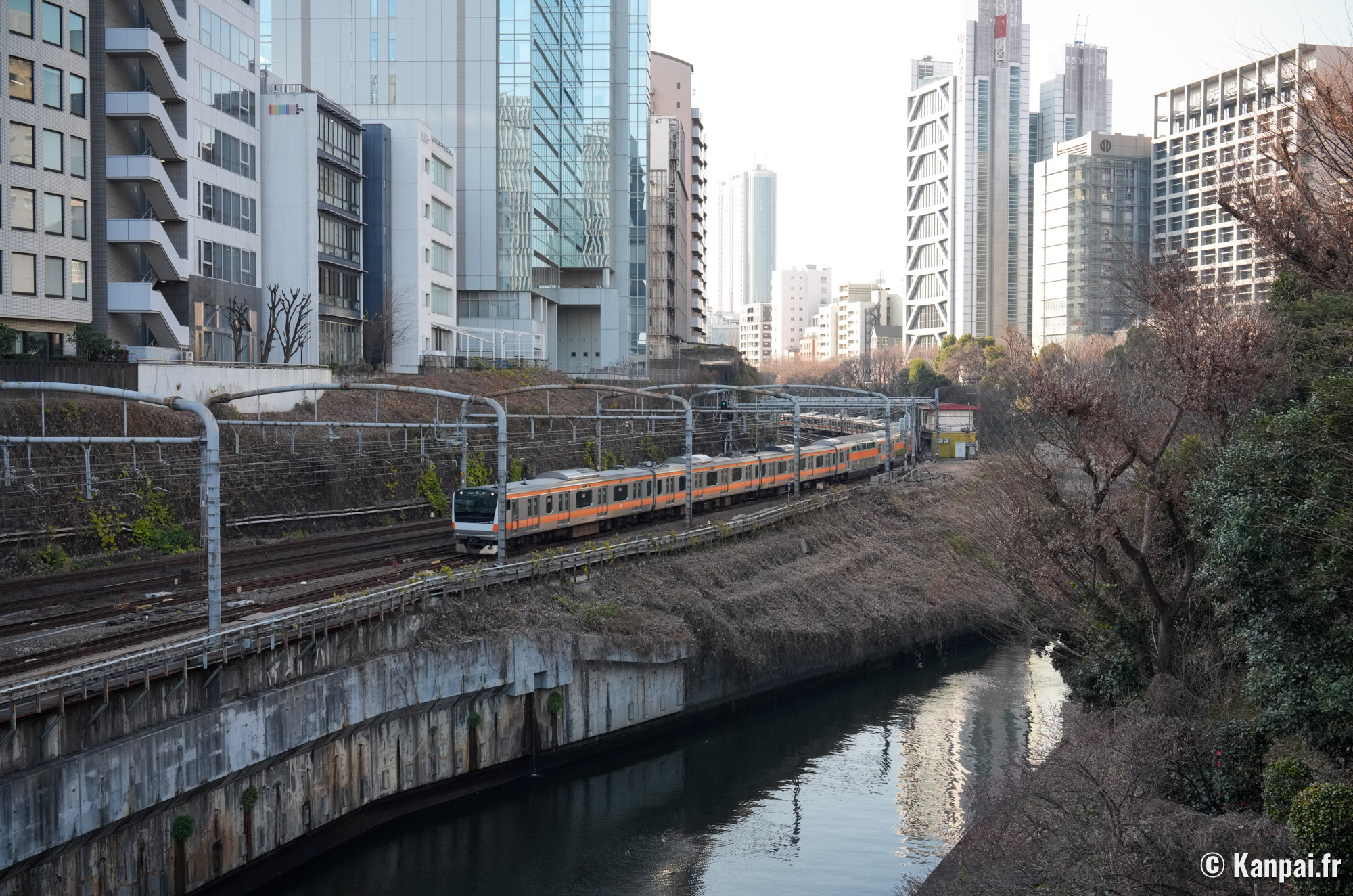 Ochanomizu dispose de 2 gares éponymes, situées face à face de part et d’autre de la rivière Kanda, la JR au sud et la Tokyo Metro au nord, qui constituent un paysage célèbre auprès des amateurs de sakura 🌸, des fans de trains 🚅 densha otaku et des fans d’anime. Les rives de la Kanda sont en effet plantées de cerisiers qui s’épanouissent au printemps, encadrant le réseau ferroviaire sur lequel on a une belle vue depuis le pont Hijiri-bashi. La sortie du tunnel et le viaduc reliant les 2 rives apparaissent dans le long métrage de Makoto Shinkai, Suzume, sorti en 2022.