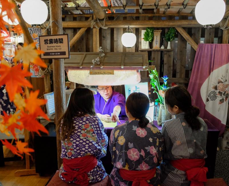 Oedo Onsen Monogatari s'inscrit dans ce concept avec la caractéristique d'être intégré au cœur d'un parc de loisirs entièrement construit dans un décor typique de l'ancien Tokyo, à l'époque d'Edo (1603-1868). Ainsi pour y pénétrer, les visiteurs sont invités à laisser leur tenue de ville au vestiaire pour enfiler le yukata, un kimono 👘 d'été, loué par l'établissement.
