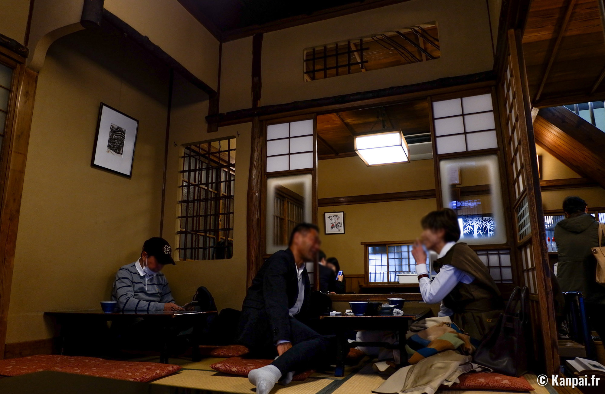 - Un espace surélevé où l’on s’agenouille à des tables basses sur tatamis. Des parois ajourées coulissantes en bois permettent une séparation du reste de la salle. On y entre déchaussés.