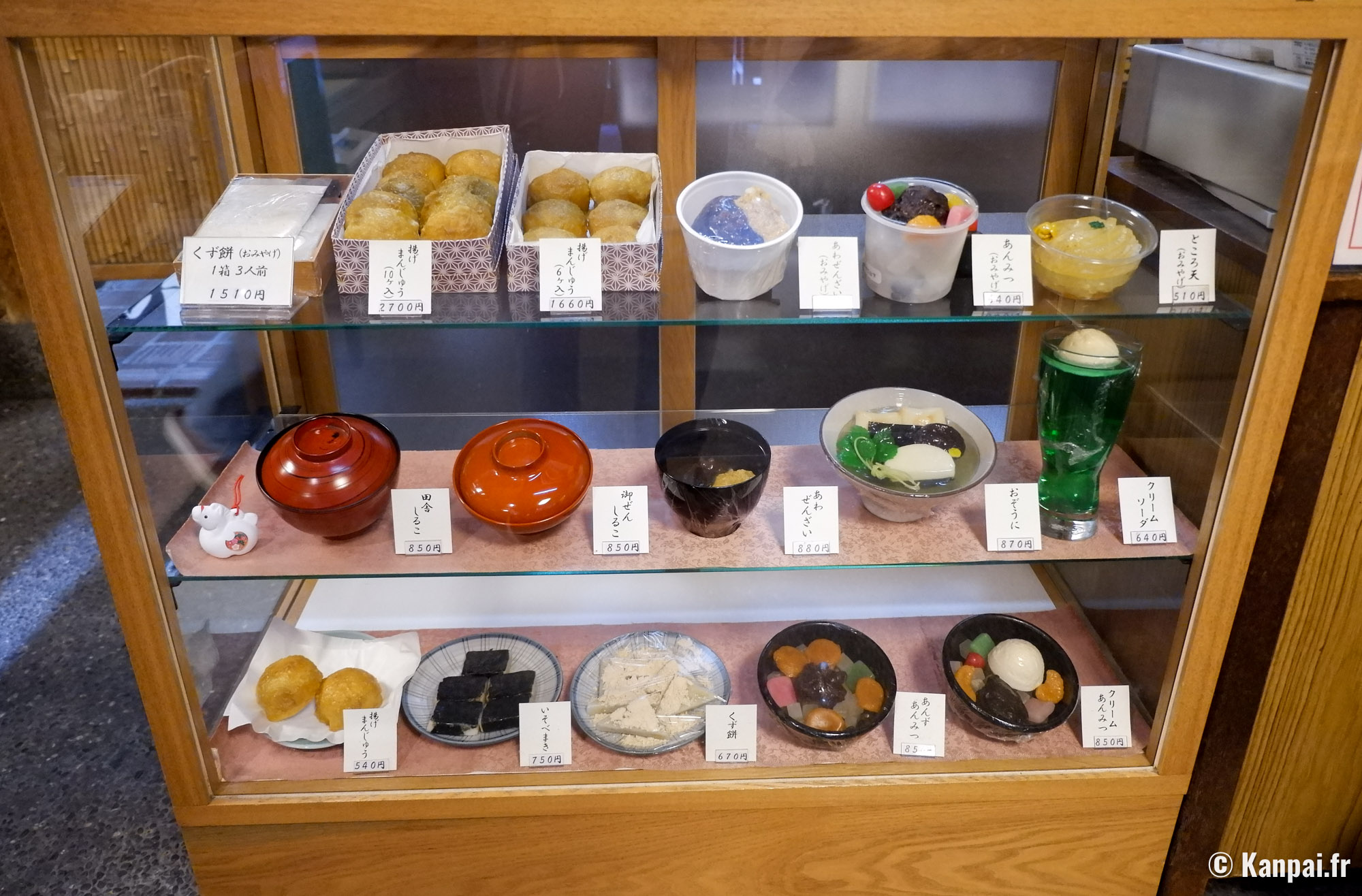 Les douceurs et plats du jour sont présentés dans une vitrine près de la caisse. L’oshiruko figure toujours à la carte, mais Takemura a construit sa réputation sur l’agemanju, un petit gâteau à base de farine de riz fourré à l’anko et frit à la commande.