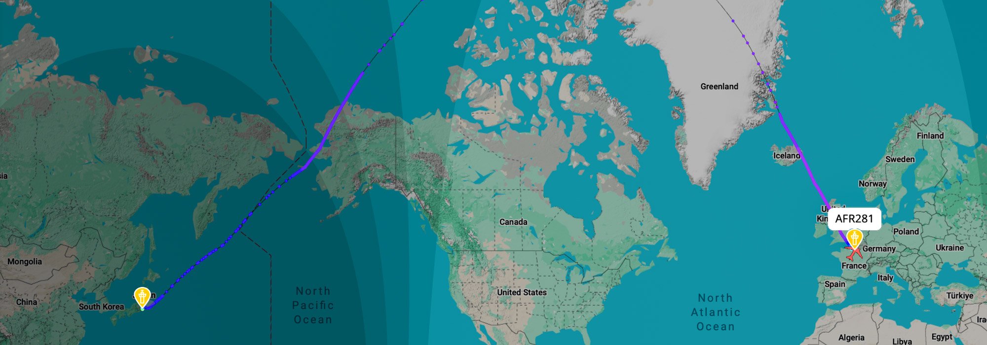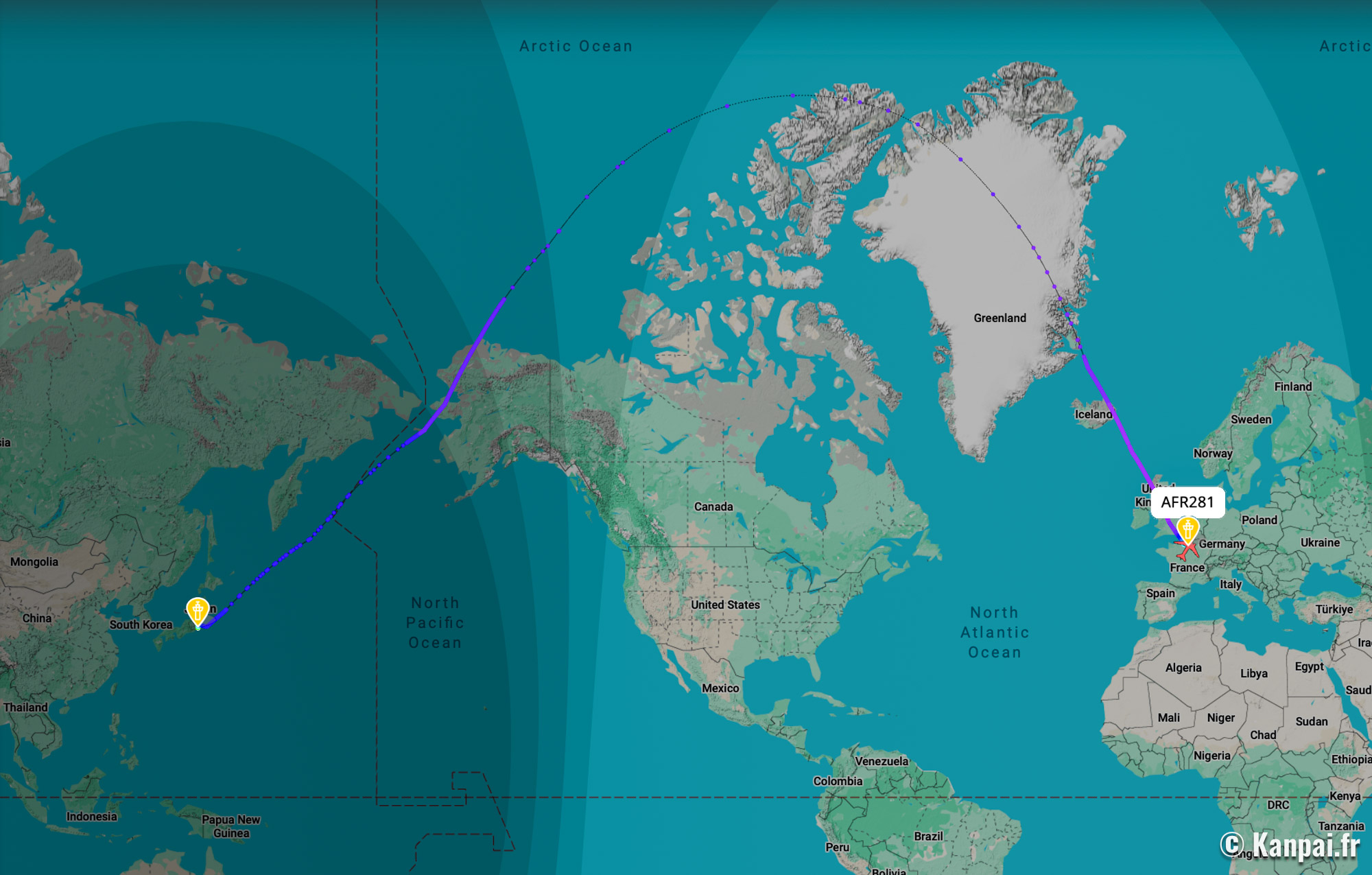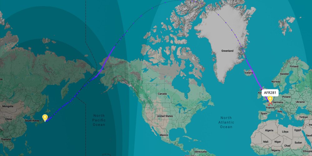 Les vols entre la France et le Japon peuvent également passer par la route du Pôle Nord via l'Amérique du Nord (voir illustration) ou continuer de survoler le continent eurasien en modifiant leur trajectoire pour passer par la Géorgie, le Kazakhstan, le nord de la Chine puis la Corée du Sud. Il faut compter, désormais, une durée moyenne entre 13h et 14h pour un vol direct France - Japon soit peu d'évolution depuis 2022.
